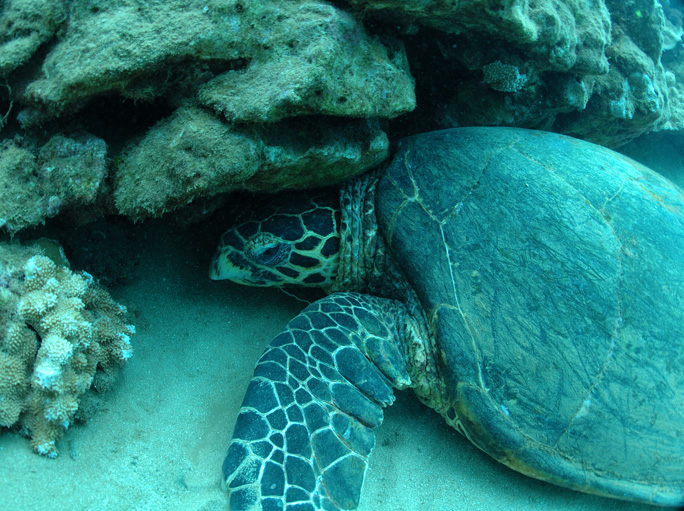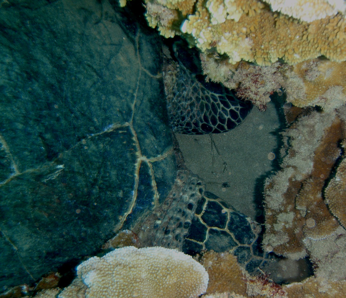 Three days ago, I was swimming on the reef and noticed one of the local Hawksbill turtles tucked down in a deep sand hole with its head completely under the coral. I thought this odd because these turtles are always active searching the reef and feeding. I have seen very few of the Hawksbills in the last couple months so seeing one and in a resting position like this was a surprise.
