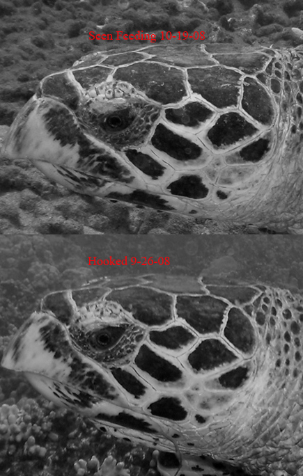 I looked for a white spot on its shell which was a mark of distinction I recalled from the "hooked" turtle above. I didn't see such a mark and figured this was another turtle. However with some close evaluation of the scales and patterns on the left side of this turtle's head, it became clear that this feeding turtle is the same turtle that was suffering from the fishing tackle last month. Below is a close up of the head in the image directly above compared to a shot with the fishing line trailing out of the mouth: