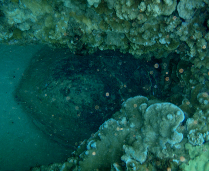 At about noon, I swam out on the reef and found this Hawksbill in one of the holes she has been using during her ordeal. She was still and not moving down in the sand. I hung around for about 20-30 minutes and she came up for air. She took a few breaths and then swam back down and settled in, once again.