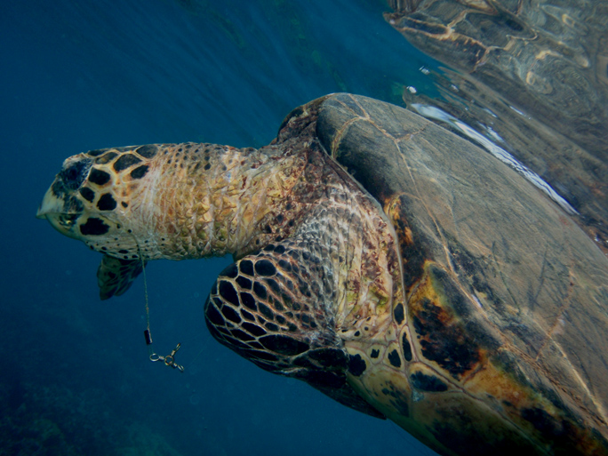 I hung around the area and waited for the turtle to surface. At one point, a woman swam up and asked me if I had seen the turtle down below. She said it had been there all day. For this Hawksbill to be down resting all day I surmise that the fishing line and tackle is having a very detrimental effect on its feeding and behavior. Fortunately, within 10 minutes of arriving on the site, the turtle came up for air.