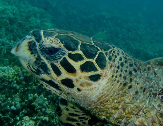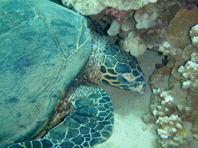 Excellent news! Less than a month later, yesterday, I came across a Hawksbill feeding actively on the reef: