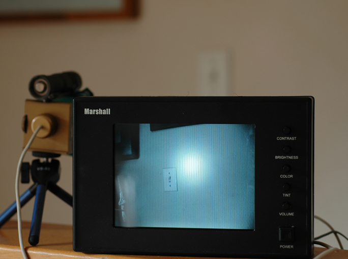 The Osram LED is driven at 525 mA on high and ~25 mA on low in these pair of "PD" flashlights. The LED couples directly to the McR-20 reflector for a nice tight collimated beam. In the photo below, a B&W lipstick video camera is below the flashlight and recording a live image on the color LCD display. The ambient light level was high enough to require no artifical lighting. You can see the wall switch both in the image of the photo as well as in the LCD screen. On the LCD screen, the video camera caught the IR beam from the flashlight.