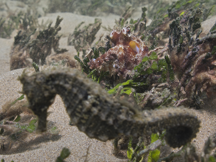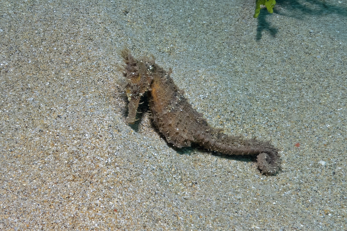 While at the surface and looking down, I spied a larger seahorse move about: