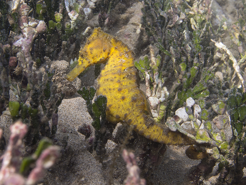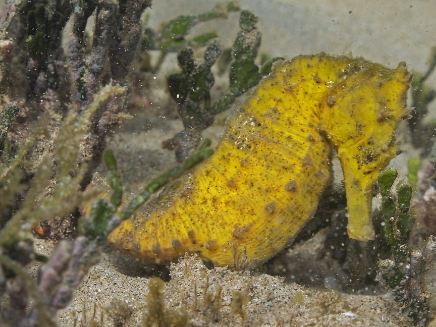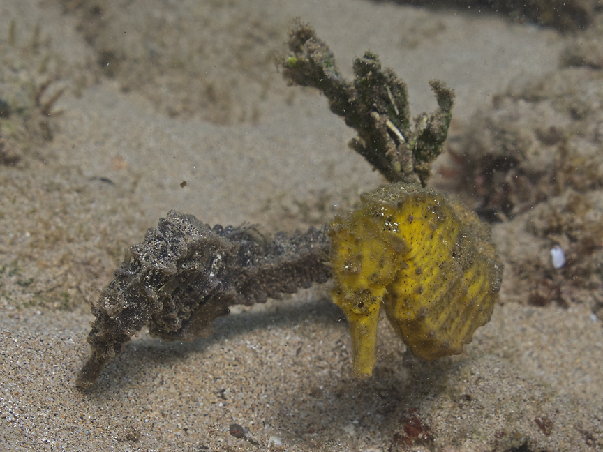 In June of 2014, I spotted a yellow seahorse in a halimeda field north of Blackrock and eventually found her male
