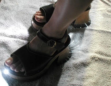 and toggle switch are contained in thick wood sole. Toggle is