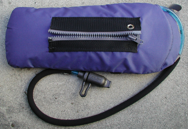 For an inflateable PFD, a CamelBack Unbottle was modified by adding a zippered web channel on the backside of the insulating sleeve. There is also a grommet near the top of the channel. This channel accepts the vertical center web strap on the back of the inflateable PFD. The channel will accommodate a vertical web strap up to 2" wide and the channel is 8" long. A corresponding grommet was placed in the vertical web strap of the PFD. A stainless steel #10 flathead machine screw is placed through both grommets and this fixes the CamelBack to the PFD so it doesn't slide up and down on the vertical strap. The Unbottle has easy external access for removing and replacing liquids.
