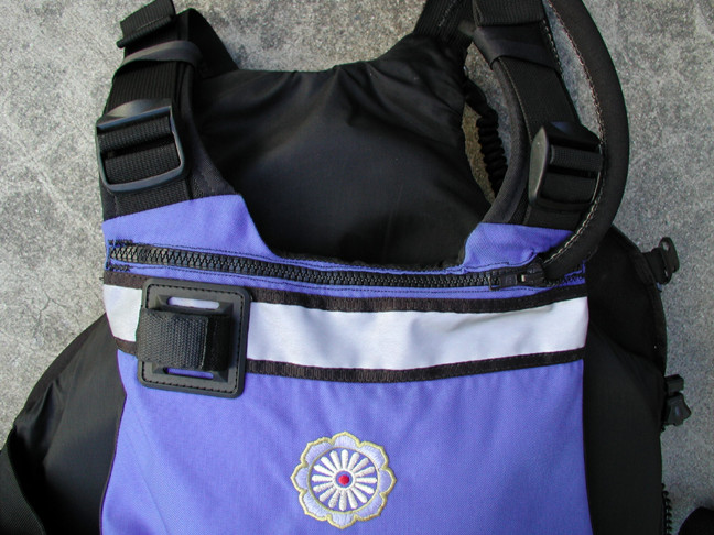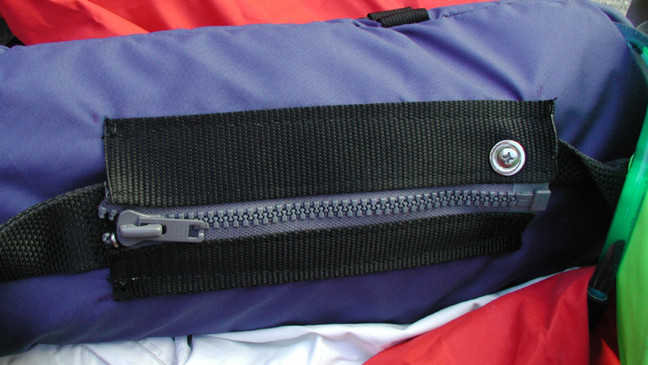 Standard PFD: An access zipper is placed across the top of the back flotation chamber. A two piece flotation foam inner "bag" receives the re-hydration bladder and insulates the contents. Instead of a standard thick piece of foam, two pieces of half the thickness can be joined at the perimeter on the bottom and sides making the "bag" . They can be joined in such a manner that they pre-form the chamber for the bladder. This has been done to a Lotus (Patagonia) PFD below: